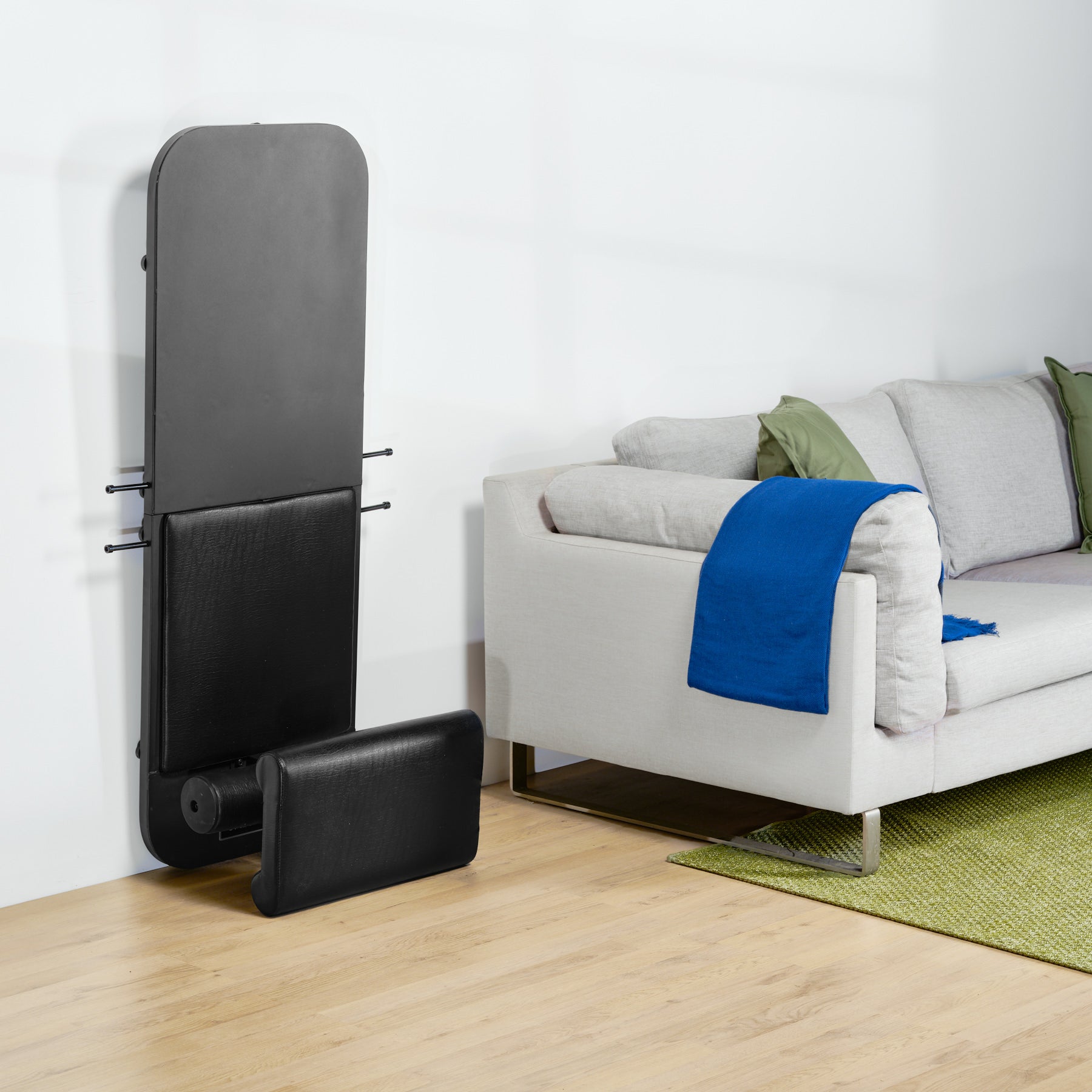The bench and roller can be quickly removed from the base for easy storage under a bed or against a wall.