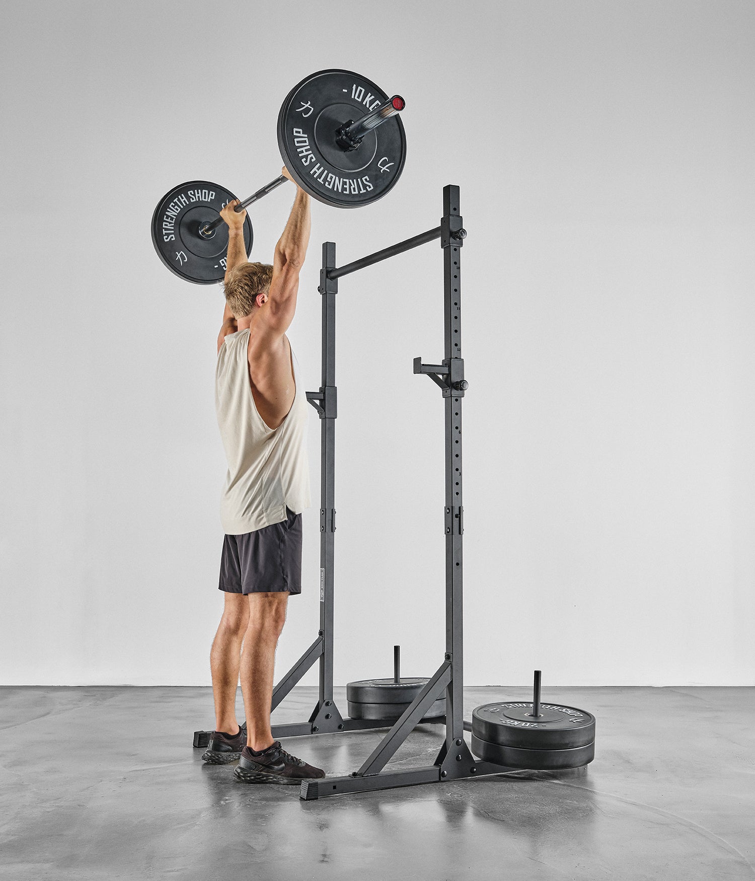 Gracias a los soportes de barra, utilice la barra de tracción con soporte para realizar sentadillas, press de banca/inclinado y press militar.