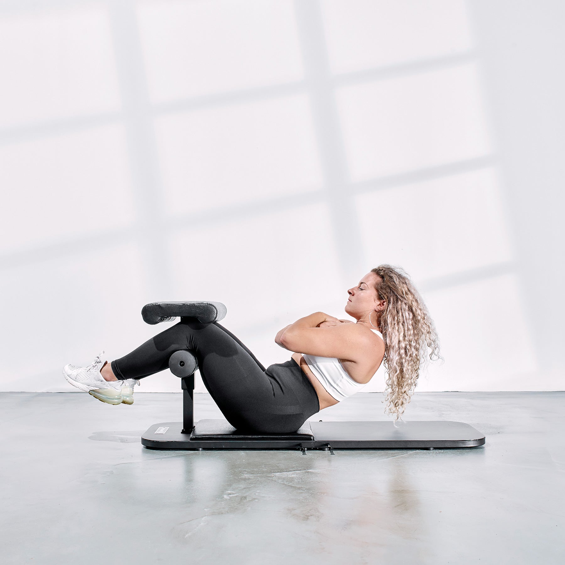 2. Arrotolate la schiena e contraete i muscoli addominali durante la spinta.