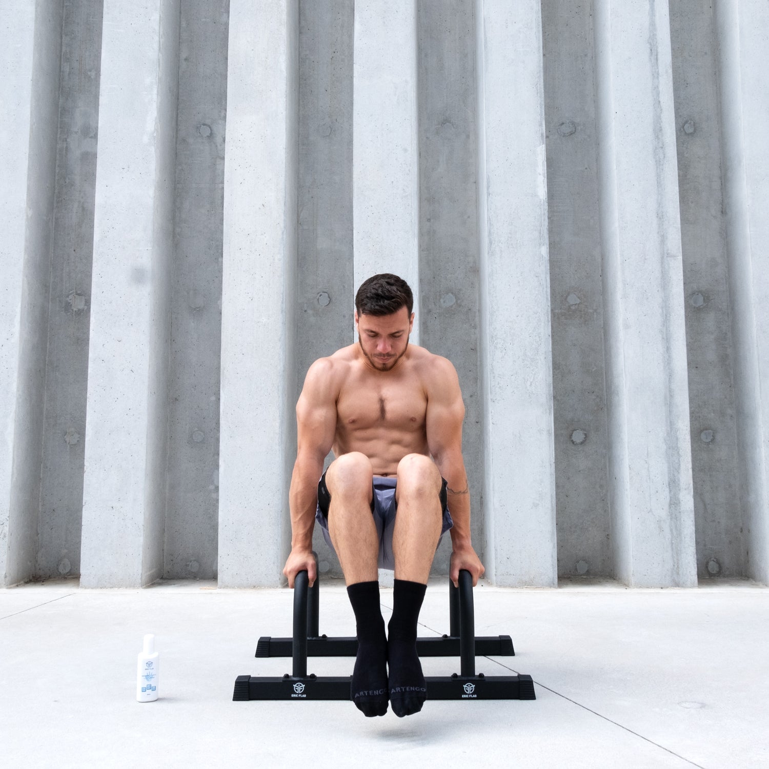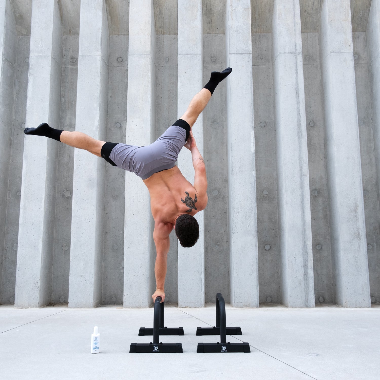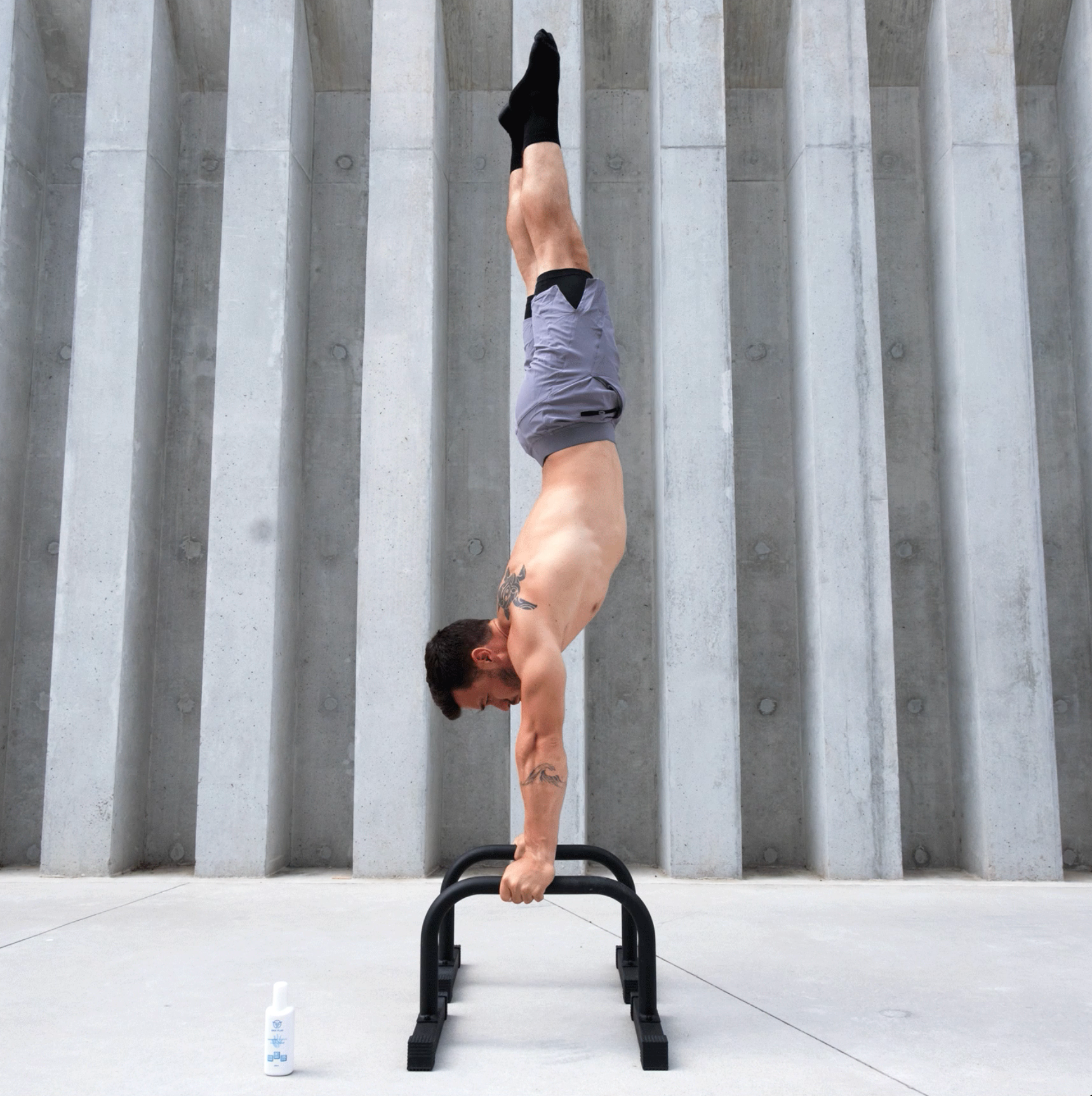 1. Placez-vous entre les Elevations bars à une distance qui vous permet de vous élever en position de handstand.
